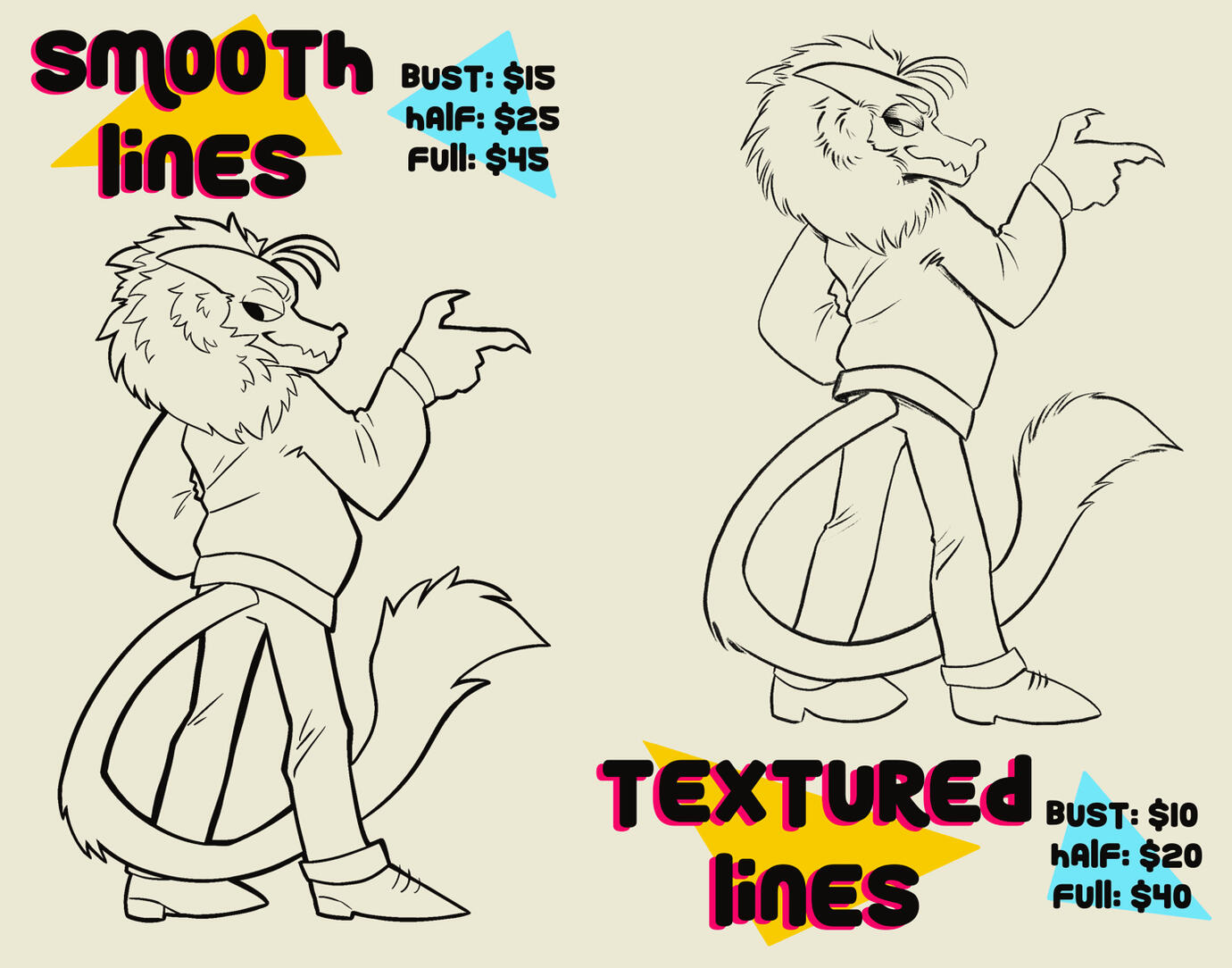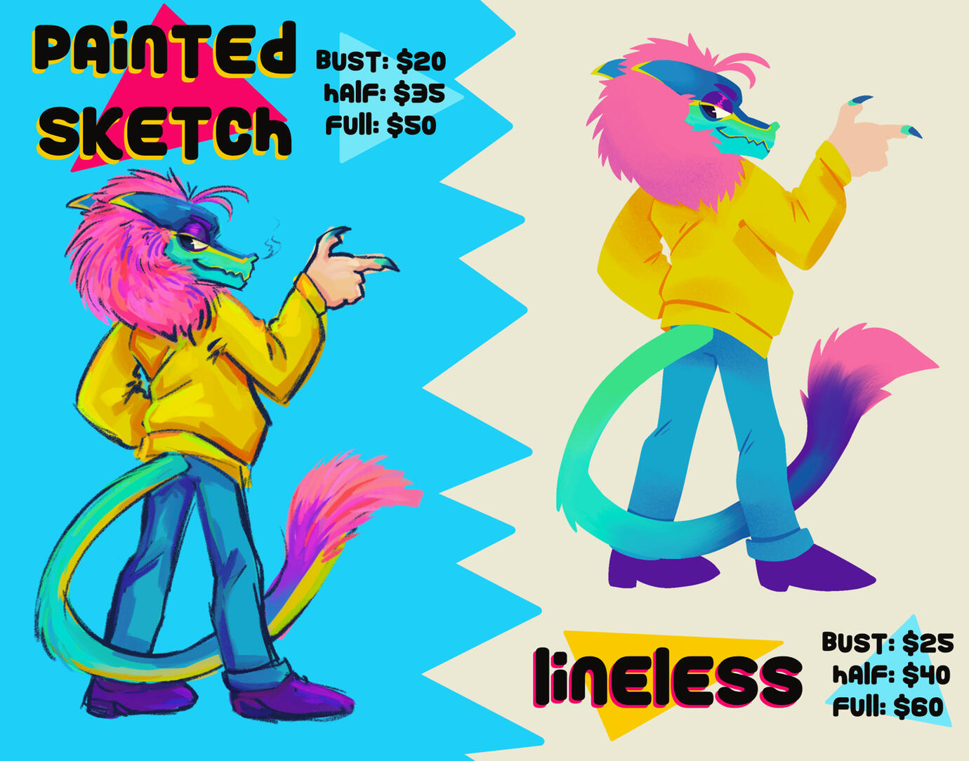 Feel free to contact me through my socials, by email, in person or via messenger pigeon at your leisure if you wish to discuss a commission with yours truly. The sheets below show pricing for standard digital commissions, but be sure to reach out if you have something else in mind!